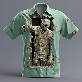 Halloween رجالي الزومبي مومياء جدار متصدع قميص زر حتى القميص كم قصير الطراز القوطي الداكن مناسب للعطلات ملابس الشارع الصيف الربيع طوي طباعة ثلاثية الأبعاد قميص بياقة أخضر فاتح أخضر