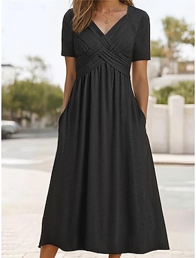 فستان نسائي كاجوال متوسط الطول بجيوب للعطلات، ملابس الشارع الأساسية، رقبة على شكل حرف V، أكمام قصيرة، لون أسود ورمادي
