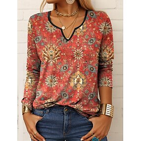 نسائي تي شيرت ظل الرسم هندسي عتيق أنيق كلاسيكي كم طويل V رقبة الرقبة المحززة قمصان عادية مناسب للبس اليومي عطلة نهاية الاسبوع طباعة أبيض وردي بلاشيهغ أحمر أزرق فاتح الربيع الخريف الشتاء