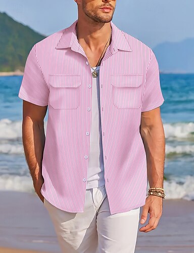 رجالي قميص قميص صيفي قميص غير رسمي قميص الشاطئ زر حتى القميص وردي بلاشيهغ نبيذ أزرق أخضر أزرق عميق كم قصير مخطط Lapel عطلة ستايل هاواي جيب أمامي ملابس خليط قطن موضة كاجوال مريح