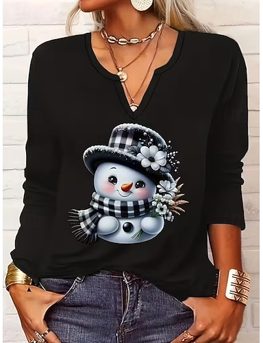 عيد الميلاد المجيد نسائي تي شيرت الرسم رجل ثلج عتيق أنيق كلاسيكي كم طويل V رقبة الرقبة المحززة قمصان عادية مناسب للبس اليومي عطلة نهاية الاسبوع طباعة أسود الربيع الخريف الشتاء