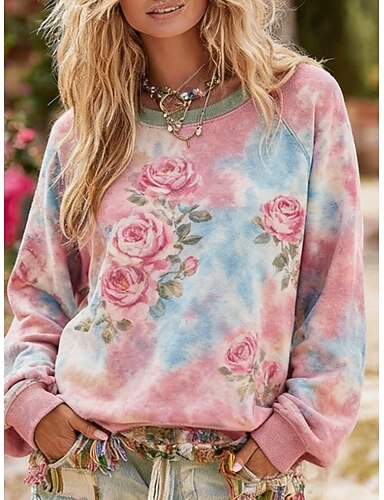 نسائي Pullover بلوزات ورد الرسم عتيق أناقة الشارع كم طويل رقبة دائرية قمصان عادية مناسب للبس اليومي فضفاض طباعة نبيذ أرجواني برتقالي أخضر الربيع الخريف