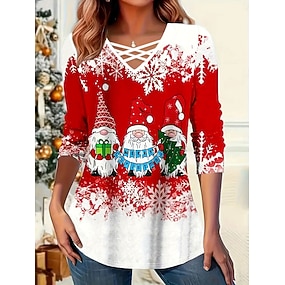 قميص تونيك نسائي بفتحة رقبة على شكل حرف V وطبعة قزم ندفة الثلج وأكمام طويلة ملابس كاجوال للعطلات باللونين الأحمر والأبيض من القماش المطاطي بقصّة مريحة وموسمية