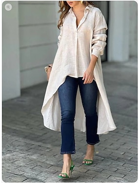 قميص نسائي من القطن والكتان مثل الكتان بلون صلب أسلوب بوهيمي يومي أنيق بأكمام طويلة ياقة عادية توبس يومية للعطلات للخروج رقعة بيضاء صيفية ربيعية