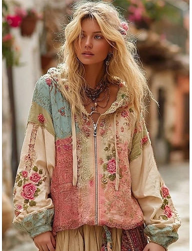 سويت شيرت هودي بوهيمية قديمة ثلاثية الأبعاد للنساء مع نقش وردي، سويت شيرت مبطن بزهور، سويت شيرت بزيب، تصميم قديم نشط بأكمام طويلة، بغطاء رأس، ملابس عادية منزلية، عناصر بطرز، وردي، الخريف، الشتاء