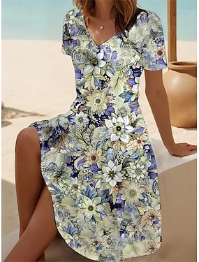 نسائي فستان قصير فستان تيشيرت فستان خفيف لباس صيفي كاجوال مناسب للبس اليومي عادي ورد الرسم كم قصير V رقبة أبيض أخضر فاتح أزرق أخضر الصيف الربيع