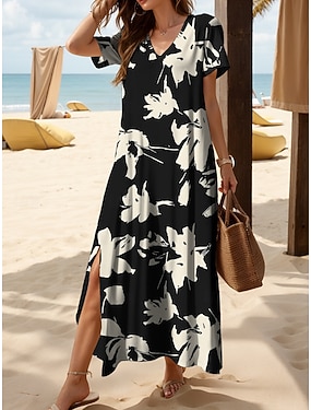 نسائي فستان طويل لباس غير رسمي فستان خفيف فستان شكل حرف A العطلة كاجوال شاطئ عادي ورد الرسم كم قصير V رقبة أسود أبيض أحمر أزرق الصيف الربيع
