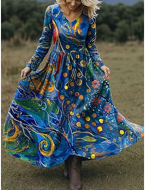 نسائي فستان طويل فستان شيفت فستان شكل حرف A كاجوال بوهو مناسب للبس اليومي مواعدة مناسب للخارج عادي ورد الرسم تاي داي كم طويل رقبة عالية مدورة أزرق الربيع الخريف الشتاء فصل الخريف