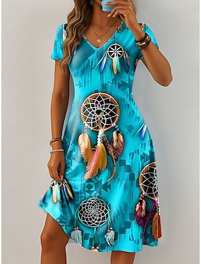 نسائي فستان قصير لباس غير رسمي فستان تيشيرت فستان خفيف فستان شكل حرف A العطلة كاجوال بوهو شاطئ عادي الرسم ريش كم قصير V رقبة أزرق أرجواني برتقالي أخضر الصيف الربيع
