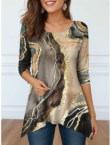 نسائي تي شيرت أحرف كاجوال كم طويل رقبة دائرية قمصان عادية مناسب للبس اليومي عطلة نهاية الاسبوع طباعة أزرق البيج الخريف الشتاء