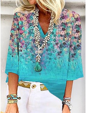نسائي بلوزة ورد الرسم أنيق كاجوال 3/4 الكم V رقبة قمصان عادية مناسب للبس اليومي أزرق أرجواني كاكي الصيف الربيع