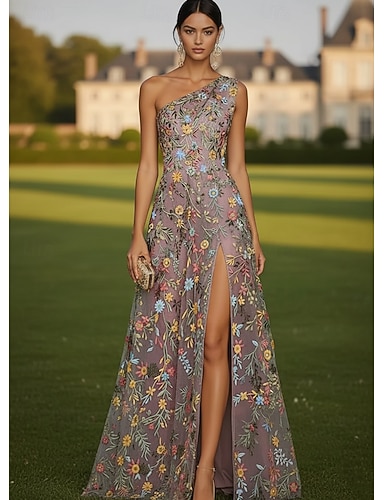 A-الخط طول الأرض فساتين السهرة الزي الرسمي أنيق زهري بدون كم كتف واحد حفلة في الحديقة زفاف شيفون تول مع طباعة الأزهار زهرة مطرزة انقسام