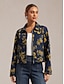 جاكيت نسائي من قماش الدنيم بطباعة كتلة ألوان صفراء ونمط زهور وياقة مطوية وتصميم سحاب مناسب للمنزل والسفر في الخريف والشتاء