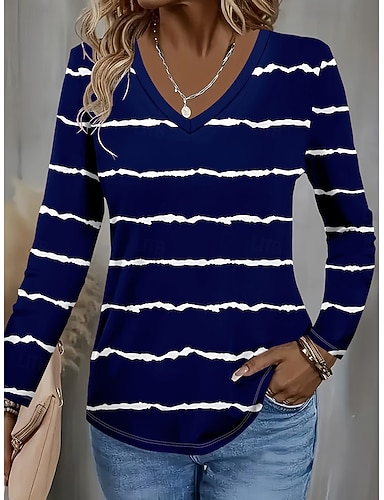 نسائي تي شيرت الرسم هندسي مخطط عتيق أنيق كلاسيكي كم طويل V رقبة قمصان عادية مناسب للبس اليومي طباعة أزرق البحرية الربيع الخريف الشتاء
