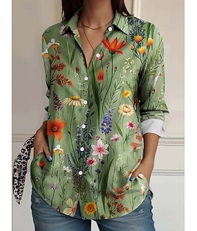 نسائي قميص ورد أنيق عتيق يوميا كم طويل قبعة القميص قمصان عادية عمل مناسب للبس اليومي Buttons طباعة أخضر عشبي الصيف الربيع