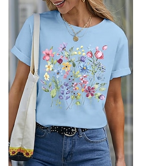 تي شيرت نسائي أساسي كاجوال بطبعة زهور بأكمام قصيرة وبلوزات عادية ورقبة دائرية للاستخدام اليومي باللون الأسود والأبيض والأزرق والأرجواني والصيف