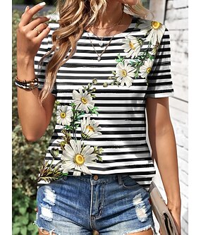 تي شيرت نسائي مزخرف بأزهار بتصميم عادي بياقة دائرية طبعة بأزرار بالأكمام القصيرة تناسب للبذل الأسود والأبيض والأصفر