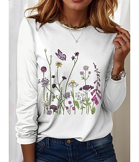تي شيرت نسائي بأكمام طويلة بياقة دائرية بلوزة عتيقة برسومات نباتات زهرية أنيقة كلاسيكية عادية للطباعة اليومية بلون أسود وأبيض ووردي وبنفسجي وأخضر لموسمي الخريف وما قبل الربيع