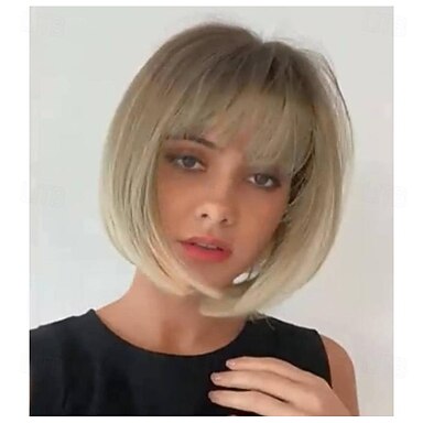 شعر مستعار قصير بوب مع غرة، شعر مستعار صناعي مفرود مقاوم للحرارة للنساء، أشقر رمادي داكن لطيف ممزوج مع أشقر، بني فاتح أسود بني أشقر فاتح، 10 بوصات