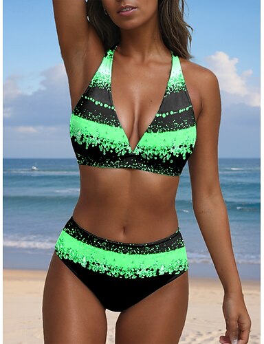 ملابس سباحة نسائية، بيكيني، قطعتين، بيكيني جريء، هولتر، مثير، تدرج، هندسي، سلك على شكل V، بدلات سباحة بدون أكمام