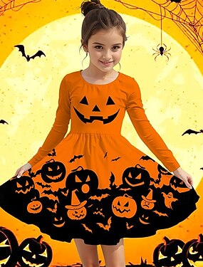 عيد الرعب الفتيات 3D قرع فستان كم طويل الصيف الربيع عطلة مناسب للبس اليومي مناسب للعطلات أميرة جميل حلو أطفال 4-12 سنة لباس غير رسمي فستان شكل حرف A طول الركبة عادي
