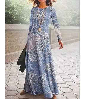 فستان ماكسي نسائي عتيق بأسلوب بوهيمي بتصميم A خط ياقة دائرية بأكمام طويلة Casual يومي مناسب عادي رسومات بايزلي أزرق داكن أخضر أخضر ربيع خريف شتاء