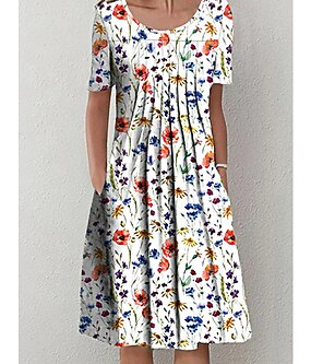 فستان ميدي للنساء فستان غير رسمي فستان مزهر أبيض بأكمام قصيرة مزهر مضغوط ربيع صيف قبة أساسية عطلة نهاية الأسبوع
