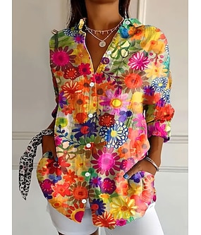 بلوزة نسائية مزودة بأزرار على شكل حرف V بطبعة زهرية أنيقة لقمصان الشاطئ بأكمام قصيرة ياقة عادية بطبعة برتقالية ربيعية خريفية