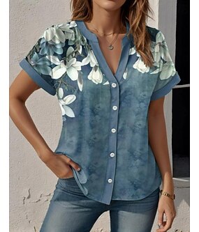 قميص نسائي، برقبة على شكل V، بلوزة زر مغلقة، مزهرة، رسومية، أنيقة، شاطئية، بأكمام قصيرة، مع ياقة قميص، قمصان عادية، للعمل اليومي، أزرار مطبوعة باللون الأزرق، الصيف، الربيع