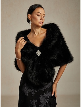 فستان سهرة رسمي نسائي من الفرو الصناعي البني مع وشاح من الخرز وأزرار باللون البني وفتحة رقبة واسعة لفصل الخريف والشتاء