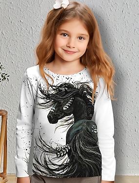 للفتيات 3D حيوان حصان تي شيرت كنزة مطبوعة كم طويل الربيع الخريف موضة أساسي أطفال 4-12 سنة رقبة العمل الأماكن المفتوحة فضفاض مناسب للبس اليومي عادي