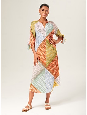 فستان ساتان فاني ملون بطباعة هندسية انسيابية