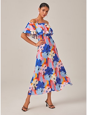 نمط زهور تجريدي، كتف واحد، حاشية مكشكشة، نمط فستان طويل أنيق.