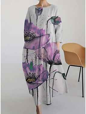 فستان ماكسي نسائي فستان كاجوال عطلة واسعة مزينة بالأزهار رسومات من الكتان مثل بأكمام بطول 3/4 ياقة عادية وردي ربيعي خريفي شتوي