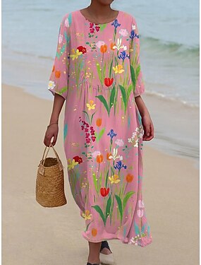 فستان ماكسي نسائي كفتان بأكمام بطول 3/4 وياقة جولة فستان كاجوال فستان شيفت فستان على شكل حرف A فستان بوهيمي يومي عطلة موعد مزخرف زهري أصفر وردي أزرق أخضر ربيع خريف