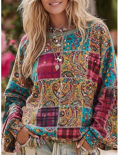 نسائي سترة تيشيرت بوهو تي شيرت الرسم منقوش ألوان متناوبة عتيق عرقي بوهو كم طويل رقبة دائرية قمصان عادية فضفاض مناسب للبس اليومي مناسب للخارج طباعة أزرق فاتح خريف & شتاء