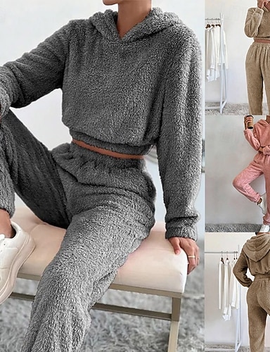 طقم ملابس نوم نسائية مكون من هودي وبنطلون رياضي بلون كريمي مريح غير رسمي مناسب للمنزل برقبة على شكل حرف V وأكمام طويلة وخصر مرن ومقاس كامل ملابس عصرية لجميع المواسم خريف وشتاء