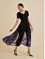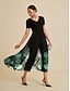 جمبسوت نسائي أسود من قماش الشيفون الصناعي مكون من قطعتين شفاف متدفق بطبعة زهور قابلة للتمدد وفتحة رقبة على شكل حرف V للحفلات والعطلات في الربيع والصيف