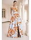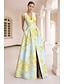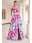 A-الخط طول الأرض فساتين السهرة منفوش الزي الرسمي سبليت عالية والدة العروس بدون كم V رقبة رسمي ضيف حفل زفاف جيبة ساتان مع طباعة الأزهار انقسام جيبة