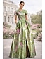 A-الخط طول الأرض فساتين السهرة منفوش أنيق عتيق زهري كم قصير V رقبة حفلة في الحديقة زفاف جيبة قماش الجاكار مع طباعة الأزهار طيات انقسام