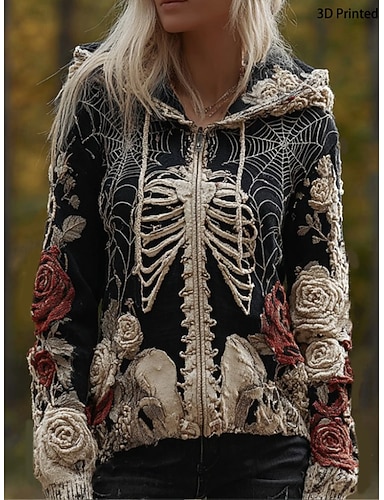 نسائي هوديس بسحاب الرسم جماجم بانغك نشيط عتيق كم طويل مع قبعة قمصان عادية المنزل مناسب للبس اليومي فضفاض بقع أسود الخريف الشتاء
