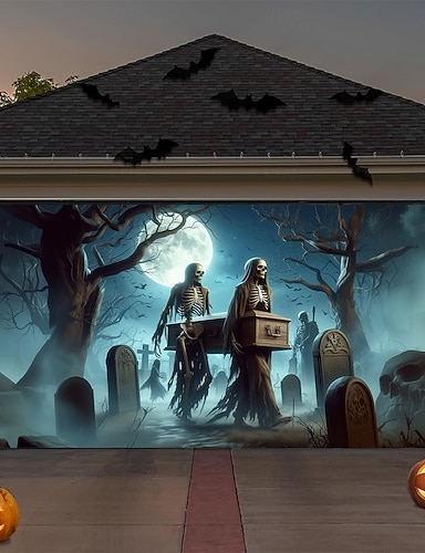 غطاء باب مرآب الهالوين على شكل جمجمة وتابوت وشبكة عنكبوت ولافتة منزل مسكون ومشهد رعب وخلفية مخيفة ونسيج للجدار الخارجي وسياج الفناء وديكور حفلة الهالوين
