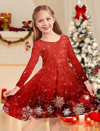 فستان عيد الميلاد للفتيات الصغيرات، فستان ندفة الثلج، أكمام طويلة، هدايا عيد الميلاد، رقبة دائرية، بوليستر يومي رائع، فستان فوق الركبة، فستان متأرجح، فستان على شكل حرف A، خريف وشتاء من 4 إلى 12 سنة