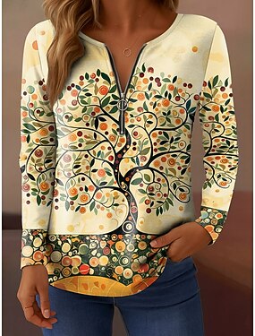 نسائي تي شيرت ورد الرسم عتيق موضة أنيق كم طويل رقبة عالية مدورة قمصان عادية مناسب للبس اليومي سحاب طباعة أصفر أزرق أخضر الربيع الخريف الشتاء