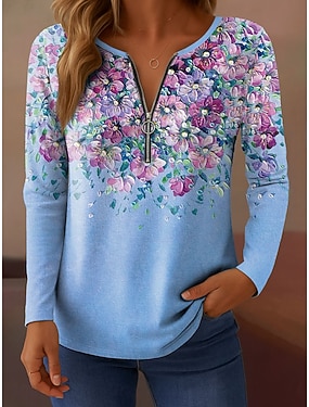 تي شيرت نسائي بأكمام طويلة بسحاب ربع على شكل V باكمام طويلة عادية أومبري تصميم فني تجريدي أنيق قديم قمصان عادية للطباعة اليومية وردي أزرق برتقالي أخضر ربيعي خريفي قبل الخريف