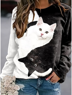 قميص نسائي بأكمام طويلة وياقة مستديرة تونك رسومي قطة حروف عتيق أنيق كلاسيكي دائري توب يومي مطبوع الأبيض الأسود الأسود الأبيض الوردي الأخضر ربيع خريف