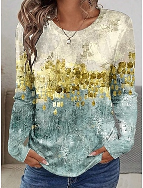 تي شيرت نسائي بياقة دائرية بأكمام طويلة تونك بتدرج أومبري قماش جرافيكي عتيق أنيق كلاسيكي بياقة دائرية عادية للقمصان اليومية مطبوع باللون اليشم لخريف