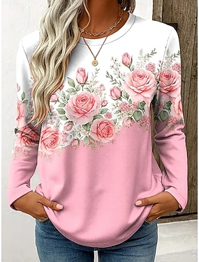 ت-shirt للنساء بأكمام طويلة ياقة دائرية تونك زهور عصرية عادية أطقم روزي طباعة يومية باللون الوردي الربيع والخريف وما قبل الخريف