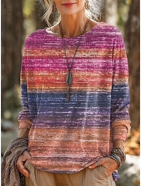 تي شيرت نسائي برقبة دائرية بأكمام طويلة، تنورة، رسومية أومبير قوس قزح عتيقة، أنيقة، كلاسيكية، tops عادية، طباعة يومية، برتقالي، خريف