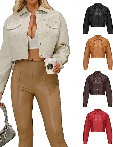 نسائي جواكيت جلد مريح جيب Buttons موضة أسلوب الشارع سهل الأماكن المفتوحة كاجوال / يومي قصيرة طوي عادي كم طويل ملابس خارجية أسود أحمر جمل الربيع الخريف